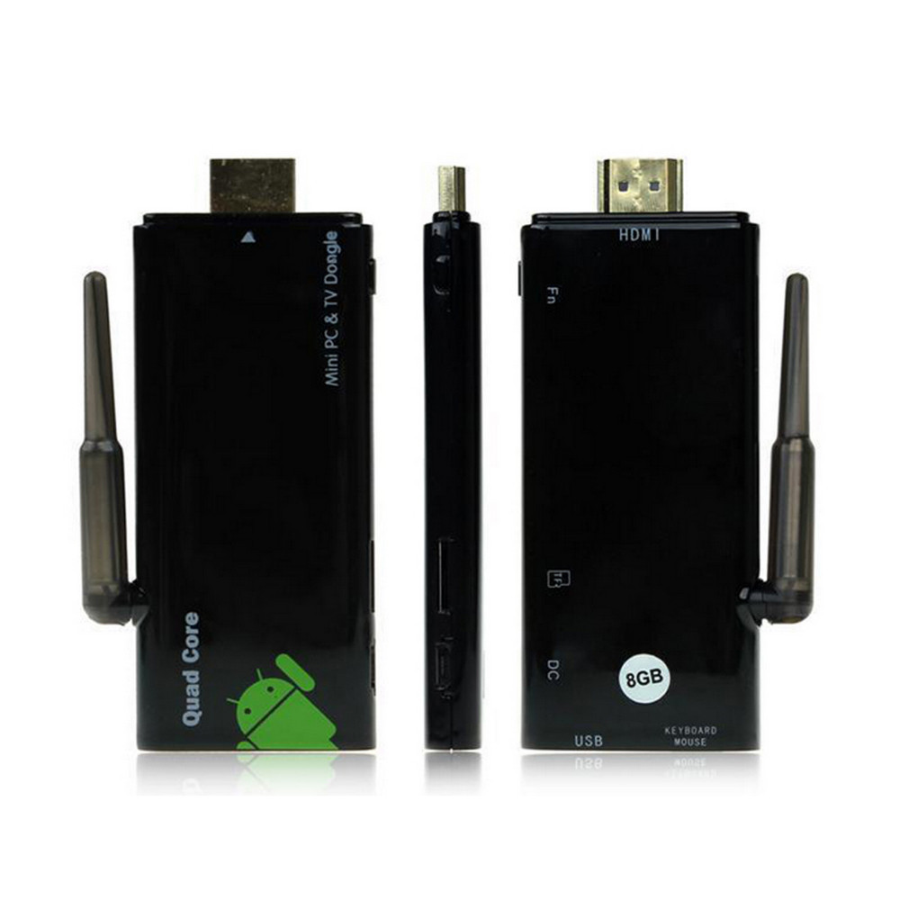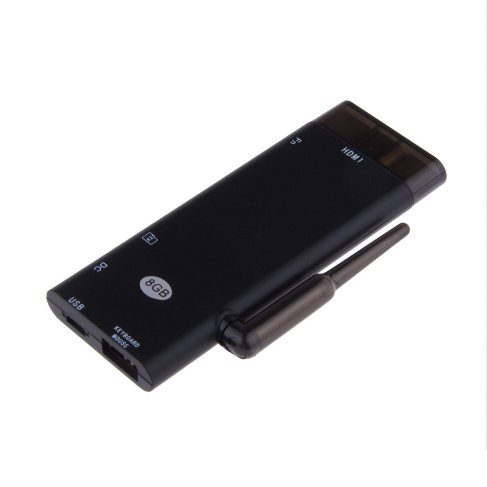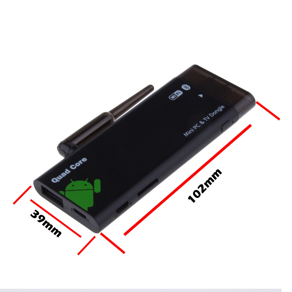 全新的四核安卓迷你电脑,搭载深度优化的Android4.4系统,通过HDMI连接电视,显示器,就可以把电视变成一台巨大的安卓系统的平板电脑。这款尺寸仅为102.2 x 47 x 11 mm,比U盘略大,却拥有了超高的硬件配置,搭载了瑞芯微最先进的四核处理器,2G超大内存,内置8G存储空间,支持TF卡扩充容量,它拥有于一个全尺寸USB接口,和一个OTG接口,一个Micro USB供电口,内置WIFI和蓝牙模块,外置增益天线,可以稳定的连接无线网络,只需插上一个无线鼠标键盘接收器,或者用播放器内置的蓝牙模块,就可以轻松自如的用键盘鼠标来控制播放器了。播放器具备电脑的基本功能可以执行电子表格、文字处理、玩游戏、播放高清视频等著多功能。